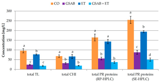 Total concentrations of pathogenesis-related (PR) proteins in Malvazija istarska wines (mean ± standard deviation; n = 3) obtained after partial fining with bentonite and/or the addition of commercial enological tannin preparation during fermentation. CO—control wine without bentonite or commercial enological tannin preparation added during fermentation, GSAB—initial dose of granular sodium-activated bentonite added near the end of fermentation, ET—commercial enological tannin preparation added during fermentation, GSAB + ET—initial dose of granular sodium-activated bentonite added near the end of fermentation and commercial enological tannin preparation added during fermentation. TL—thaumatin-like proteins, CHI—chitinases, RP-HPLC—reverse phase high-performance liquid chromatography, SE-HPLC—size exclusion high-performance liquid chromatography. Different lowercase letters above bars represent statistically significant differences among treatments with respect to total bentonite dose required, at p < 0.05 obtained by one-way ANOVA and LSD test.