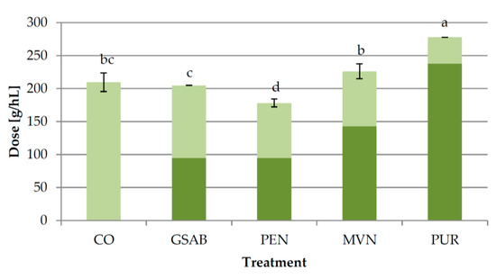Doses of bentonite required for protein stabilization of wines in different treatments of Experiment 3 determined by heating stability test. CO—control wine without bentonite in fermentation, GSAB—initial dose of granular sodium-activated bentonite CX Special Grain added near the end of fermentation, PEN—initial dose of sodium-activated bentonite Pentagel added near the end of fermentation, MVN—initial dose of activated sodium bentonite with specifically adsorbed silica and activated silica Mastervin Compact added near the end of fermentation, PUR—initial dose of active sodium-calcium bentonite Siha Puranit added near the end of fermentation. The wines were treated by additional granular sodium-activated CX Special Grain bentonite doses after fermentation to achieve total protein stability. Dark color segments of the bars represent initial doses, and light color segments represent additional doses. Different lowercase letters above bars represent statistically significant differences among treatments with respect to total doses applied, both at p < 0.05 obtained by one-way ANOVA and LSD test.