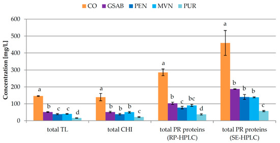 Total concentrations of pathogenesis-related (PR) proteins in Malvazija istarska wines (mean ± standard deviation; n = 3) obtained after partial fining with different types of bentonite in fermentation. CO—control wine without bentonite in fermentation, GSAB—initial dose (95 g/hL) of granular sodium-activated bentonite CX Special Grain added near the end of fermentation, PEN—initial dose (95 g/hL) of sodium-activated bentonite Pentagel added near the end of fermentation, MVN—initial dose (143 g/hL) of activated sodium bentonite with specifically adsorbed silica and activated silica Mastervin Compact added near the end of fermentation, PUR—initial dose (238 g/hL) of active sodium-calcium bentonite Siha Puranit bentonite added near the end of fermentation. TL—thaumatin-like proteins, CHI—chitinases, RP-HPLC—reverse phase high-performance liquid chromatography, SE-HPLC—size exclusion high-performance liquid chromatography. Different lowercase letters above bars represent statistically significant differences among treatments with respect to total bentonite dose required, at p < 0.05 obtained by one-way ANOVA and LSD test.