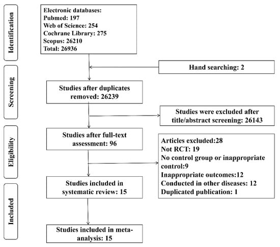 As shown in Figure 1, our initial search yielded 26,936 articles, 697 of which were deleted following the removal of duplicates. Of the remaining studies, 15 RCTs were selected for inclusion in the present study after screening. These studies were conducted in Iran [20,29,30,31,32,33,34,35,36], Malaysia [37], China [38], Sweden [39], Saudi Arabia [19], Japan [40] and Brazil [41]. The included studies comprised two double-blind randomized cross-over controlled clinical trials [30,31], eight double-blind randomized controlled clinical trials [19,20,29,32,33,36,38,39], three randomized, double-blind, parallel-group, placebo-controlled trials [34,37,41], one single-blinded clinical trial [35], and one interventional RCT [40]. Probiotics were supplemented in different forms, which included fermented milk [34,36,40,41], yogurt [33], freeze-dried powder in a capsule [19,20,29,32,35,38,39] or sachet [37], or symbiotic food [30,31]. The studies administered either one [30,31,34,38,39,40], two [33,41], three [36], four [35], six [37] or more [19,20,29,32] bacterial species. The characteristics of these included RCTs have been listed in Table 1.