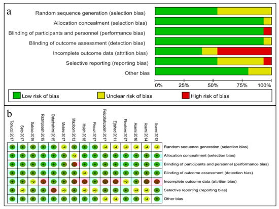Risk-of-bias assessment for the included RCTs. Risk of bias summary (a) and graph (b). Note: “+”: low risk, “?”: unclear risk, “−”: high risk.