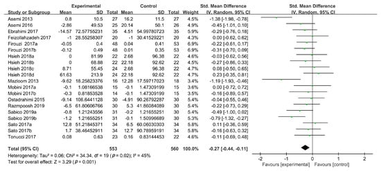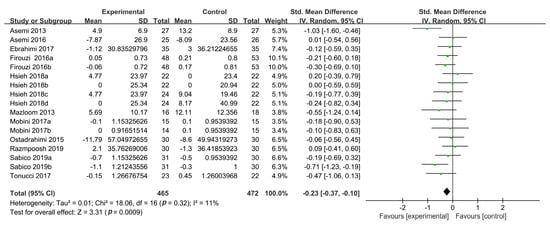 In total, 13 studies reported plasma TC concentrations, 3 of which had two intervention groups [19,37,39] and 1 had four intervention groups [38]. All experimental groups in these studies were defined as separate studies for inclusion in this study (n = 19). Compared with the control treatment, probiotic supplementation did not reduce TC concentrations (SMD: −0.19, 95% CI: (−0.48, 0.10), p = 0.20) in the random-effects model, and the heterogeneity was high (n = 19; I2 = 82%). The results of sensitivity analysis showed that the high heterogeneity was derived from two studies in particular [38]. The exclusion of these two RCTs reduced the heterogeneity to 11%, revealing a reduction in the TC concentrations (SMD: −0.23, 95% CI (−0.37, −0.10), p = 0.0009) (Figure 3).