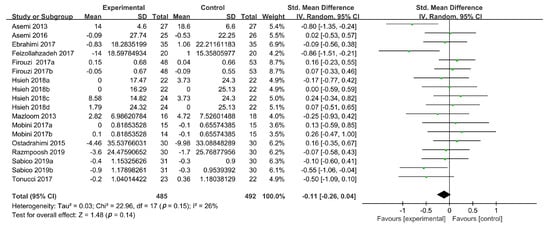 TG concentrations were reported in 15 studies, 4 of which had two intervention groups [19,37,39,40] and 1 had four intervention groups [38]. In total, 22 intervention groups were evaluated for TG concentrations in this meta-analysis. Probiotic intake did not reduce TG concentrations (SMD: −0.19, 95% CI: (−0.44, 0.06), p = 0.15) in T2DM patients in the random-effects model. In addition, significant heterogeneity (n = 22; I2 = 79%) was found between the studies. A sensitivity analysis showed that the high heterogeneity was derived from two studies [30,33]. Upon the exclusion of these two studies, the heterogeneity was reduced to an acceptable level (I2 = 45%), and a significant reduction in the TG concentrations could be observed (n = 20; SMD: −0.27, 95% CI: (−0.44, −0.11), p = 0.001) (Figure 4).
