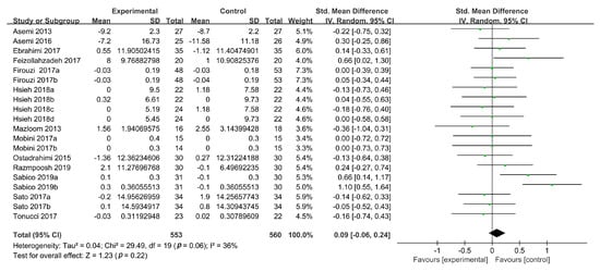 HDL-C concentrations were reported in 15 studies, 4 of which contained two intervention groups [19,37,39,40] and 1 included four intervention groups [38]. These groups were divided and treated as separate RCTs, yielding 22 studies for the evaluation of HDL-C concentrations. The calculated SMDs showed that probiotic intervention significantly increased the HDL-C levels (SMD: 0.25, 95% CI: (0.01, 0.50)), but heterogeneity was high between the studies (n = 22; I2 = 78%; p = 0.05). A sensitivity analysis identified two studies [30,33] that contributed to the high heterogeneity. After excluding these RCTs, the heterogeneity reduced to 36%, but the increase in the HDL-C concentrations caused by probiotic consumption (SMD, 0.09, 95% CI: (−0.06, 0.24), p = 0.22) became nonsignificant compared with the placebo group (Figure 6).