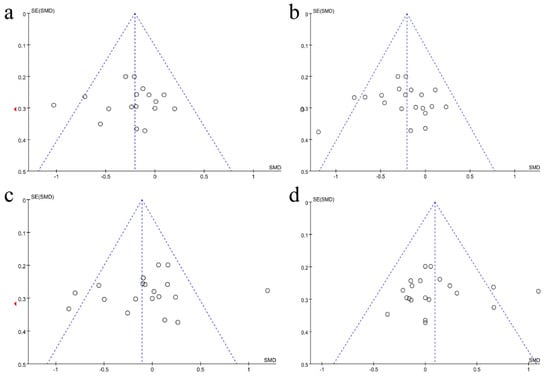 Funnel plots demonstrating publication bias in the included RCTs reporting the effects of probiotic intake on dyslipidemia. Note: Each dot represents a different study. (a) TC levels; (b) TG levels; (c) LDL-C levels; (d) HDL-C levels.