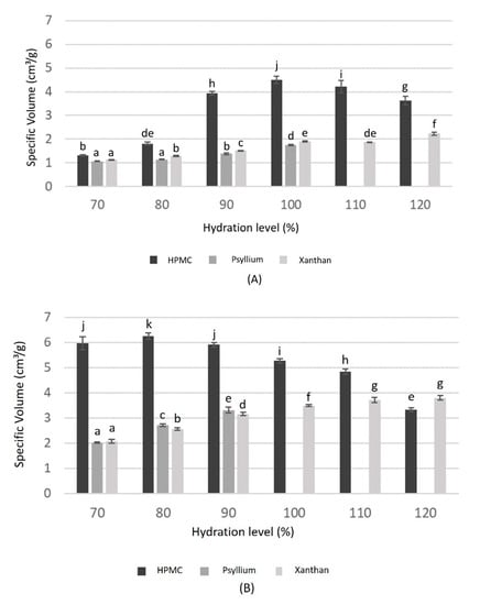 Variation of specific volume at different hydration levels for each gluten-free bread formulation and hydrocolloid: (A) rice flour (RF); (B) maize starch (MS). Same letters above bars means that there are no significant differences between those values (p < 0.05).