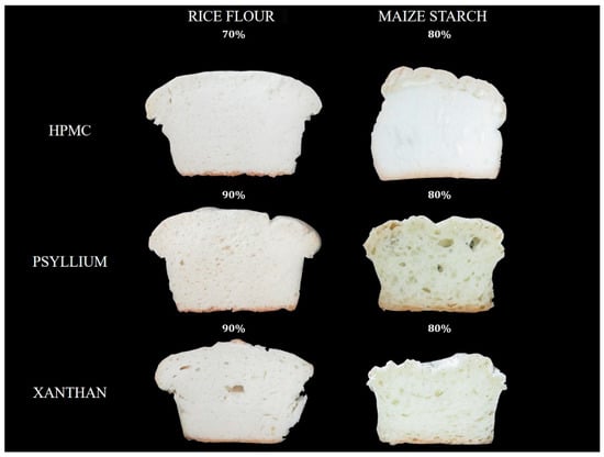 A gluten-free bread recipe was composed as follows (per 100 g flour or starch): 100 g of maize starch (MS) or rice flour (RF), 6 g of sunflower oil, 5 g of sugar, 3 g of yeast powder, 1.8 g of salt and 2 g of hydrocolloid (HPMC, xanthan gum or psyllium). The amount of water was defined according to topic 2.3.