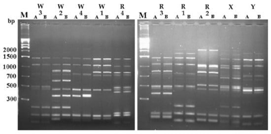 Interdelta patterns of commercial starter strains used in this study. A and B are replicates of the same strain. X and Y are S. cerevisiae strains belonging to the personal collection. W and R are strains used for Greco di Tufo (White) and Aglianico of Taurasi (Red) fermentations, respectively. M: marker 1 kb Ladder plus (InvitrogenTM)