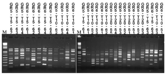 Interdelta patterns of selected S. cerevisiae strains isolated from natural fermentations Greco di Tufo (GR)5 and GR6. T5, T10 and T20: strains isolated after 5, 10 and 20 days of fermentation.