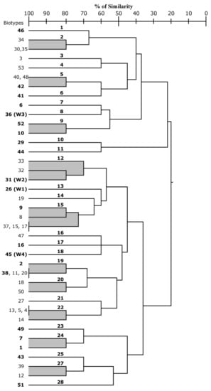 Forty-three S. cerevisiae biotypes obtained from the ten GR experimental vinifications plus four commercial starter strains (W1, W2, W3, W4) were characterized under a technological point of view (Table 5). All strains were able to grow in YPD broth at pH 3.50 containing 200 mg/L of potassium metabisulfite. No strains exhibited esterasic activity against Tween 80, or β-glucosidasic hydrolysis of cellobiose. Eighteen strains (including W3 and W4) out of 47 were able to grow in presence of 15% ethanol. Of the remaining strains, 20 (including W1) were resistant at 14%, whilst eight (including W2) were at 13% and one at 12%. On the basis of the H2S production, strains were gathered in three groups: 15 strains were low producers (level < 2); 21 strains (including W1, W2 and W3) were medium producers (level 2–3); 11 strains (including W4) were high producers (level 3–5). The killer factor proved to be quite widespread within strains; in fact, 18 wild strains, plus three commercial cultures (W1, W2, and W3), displayed this trait. According to obtained outcomes, only 18 strains (38%), including W1 and W4, were able to low the °Brix of at least three points after five days of fermentation. Finally, just 15 cultures exhibited a dispersed type of growth at the tested conditions (Table 5). On the basis of cluster analysis, at 70% of similarity, strains could be gathered in 28 groups (Figure 3). A total of 21 strains (including W1, W2, W3 and W4) were tested in micro-vinification experiments in sulfated Greco di Tufo must (20.5 °Brix). Fermentation performances of selected wild S. cerevisiae strains versus commercial strains are summarized in Table 6.