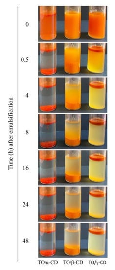During the incubation of the α-, β-, and γ-CD aqueous solutions with crude TO, the oil phase tended to disperse due to the formation of TO/CD aggregates initially suspended in solution. When emulsions were left to stand, a phase separation appears in all samples (Figure 1).