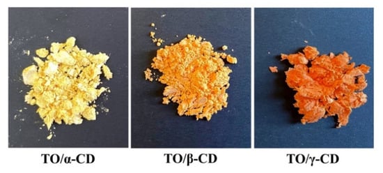 Clear differences in the color and macroscopic appearance of the samples were also noticed after freeze-drying (Figure 2). The TO/α-CD dehydrated material appeared yellow-orange, harsh with a rough dry-straw texture, TO/β-CD was, instead, an orange soft and silky powder, whereas TO/γ-CD gave a greasy and smooth compact orange-red substance strongly tingent to the touch.