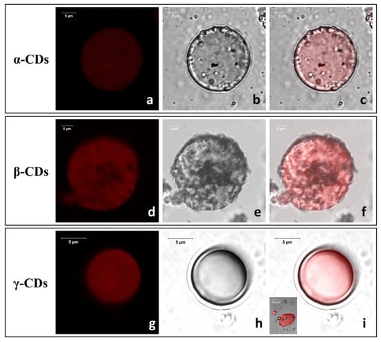 For LCSM, 100 µL of TO/α-, β-, and γ-CD emulsions were gently mixed with 10 µL of melted 1% agarose solution. The emulsion was rapidly loaded by capillarity between a coverslip and a microscope slide glass separated by 0.17 mm spacers, allowed to form a gel, and observed with a LSM 710 Zeiss (ZEN Software, GmbH, Germany) using excitation wavelengths of 488 and 543 nm. Lycopene autofluorescence was detected within the 500–550 nm wavelength range, assigning the red color.
