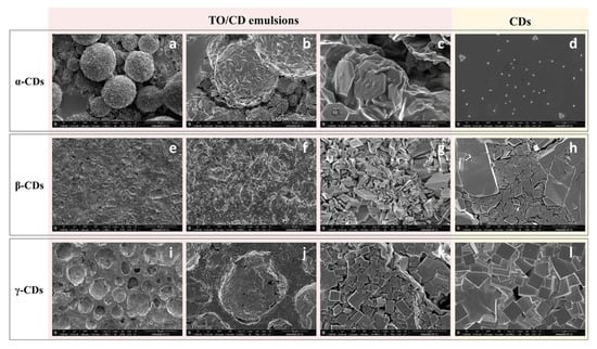 An amorphous compact surface revealing the presence of underneath crystalline material in correspondence with sporadic cracks (Figure 4e–g), or a compact background of tetragonal crystals furrowed by several roughly hemispheric cavities (Figure 4i–k) were, instead, observed in air-dried TO/β- and γ-CD emulsions, respectively. In both samples, the microcrystals observed under SEM were formed independently of the presence of TO (Figure 4h,l), indicating they simply result from uncomplexed CDs crystallization.