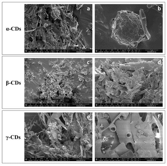Mathapa and Paunov [37] reported the formation of collapsed or hollow colloidosomes after gold-sputtering under high vacuum depending on the compactness of their protective shell. This treatment was in fact able to evaporate the oil core from the CD-stabilized oil/water emulsion. Thus, the amorphous surface observed in air dried TO/β-CD emulsion may likely be the result of the collapse of β-cyclodextrinosomes, while the hemispheric cavities observed in TO/γ-CD emulsion may represent the imprints of oil droplets (oil shadows) left after oil evaporation, suggestive of a weaker shell formation or a complete lack of coating, respectively. The formation of a loose layer of β-CD rich crystals around TO droplets in β-CD-stabilized emulsions accounts likely for the low density of the disperse phase and its scarce tendency to separate by sedimentation (Figure 1, middle vial). On the other side, the ability of α-CD-encapsulated TO droplets to retain their spherical shape under vacuum is consistent with the formation of highly compact and thick α-CD rich capsules responsible for a fast sedimentation rate (Figure 1, left vial). Nevertheless, crack opened hollow cyclodextrinosomes were found also in the TO/α-CD sample (Supplementary Figure S1).