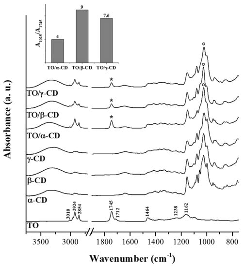 FTIR-ATR (Fourier transform infrared-attenuated total reflection) spectra of TO, CD native powders, and TO/CD freeze-dried powders. When present, the CD most intense band at around 1025 cm−1 was taken as reference signal for normalization of traces. Asterisks and circles indicate marker bands for TO and CD, respectively. The trend of their ratio in TO/CD freeze-dried powders is depicted in the histogram.