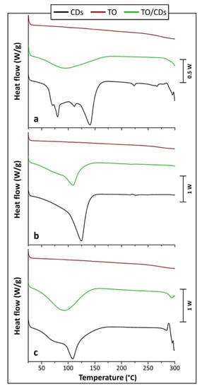 The thermal behavior of free CDs, TO, and TO/CD powders was studied by differential scanning calorimetry (DSC 822 Mettler Todedo, Columbus, OH, USA) calibrated with a pure indium standard. Samples (from 5 to 10 mg), sealed in aluminum pans, were examined in a range of temperature of 25–300 °C. An inert atmosphere (nitrogen, flow rate: 80 mL/min) and a constant heating rate of 10 °C/min were employed during the dynamic thermal scan. The results of, at least, three independent experiments, were averaged.