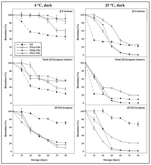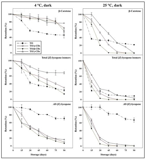 The time course stability of TO/CD emulsions and powders evidenced a rapid decline of carotenoid content at 25 °C, regardless of CDs type. Low temperature slowed down β-carotene degradation in both TO/CD emulsions and powders, while its effect on lycopene isomers was negligible. Any type of CDs seemed suitable to improve all-[E]-lycopene shelf-life stability.