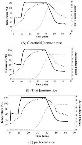 Clearfield Jazzman (A), Thai Jasmine (B), and parboiled (C) rice slowest heat penetration data at 0 SPM displaying retort temperature (