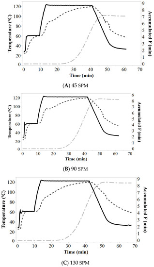 Heat penetration was determined for all retort runs and data was presented for the slowest probe of heat penetration with no reciprocal agitation of CJ, TJ, and PB rice (Figure 1A–C). The heat penetration of the product temperature lags the retort temperature during come-up, cook and cool for all rice, and the heat penetration profiles appear similar to slower heat penetration after the apparent gelatinization of rice starch during the cook and cool. The heat penetration profile with reciprocal agitation of 45, 90, and 130 SPM for CJ rice showed that with increasing reciprocal agitation, the temperature increased more rapidly with agitation during the 10 min hold for CJ rice (Figure 2A–C). A similar trend was observed for TJ and PB rice (Supplementary Figures S1 and S2). The retort temperature was held at 60 °C, a temperature lower than gelatinization, with reciprocal agitation to enhance hydration prior to gelatinization and potentially shorten the processing time. The product and retort heat penetration data were more closely overlayed with increased reciprocal agitation during the first 10 min of processing (Figure 2A–C) compared to static (Figure 1A). However, 90 and 130 SPM had minimal differences in heat penetration during come-up. Reciprocal agitation provided quicker heat transfer to the product during come-up and hold. After reciprocal agitation halted, heat penetration was similar. Subsequent gelatinization of rice resulted in heat transfer by conduction. Heat transfer was not improved if reciprocal agitation was continued during the cook and cool. The F0 values from the slowest heat penetration data ranged between 7 and 9 min for CJ rice, above the target of 6 min, attributed to the challenges to estimate the time to enter and exit cool with rice gelatinization.