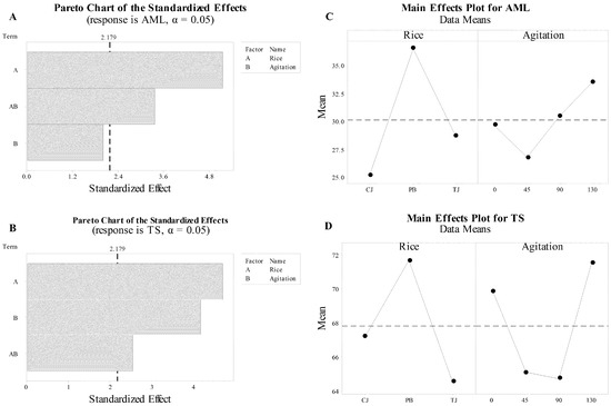 The main effect plots complement the Pareto charts for amylose and total starch (Figure 3C,D). The dotted reference line represents the average of the response. The trend of rice and agitation is not parallel to the X-axis, which shows the main effect of these parameters on amylose. The main effects plot shows that PB rice had a positive effect on amylose and total starch in comparison with aromatic rice (CJ and TJ, Figure 3C,D), and reciprocal agitation tends to increase amylose; however, the change in the magnitude of the response is not large enough to be significant. In the main effects plot for total starch, there is no consistent trend to describe total starch fluctuations with reciprocal agitation; PB tends to have a higher total starch effect than CJ or TJ (Figure 3D).