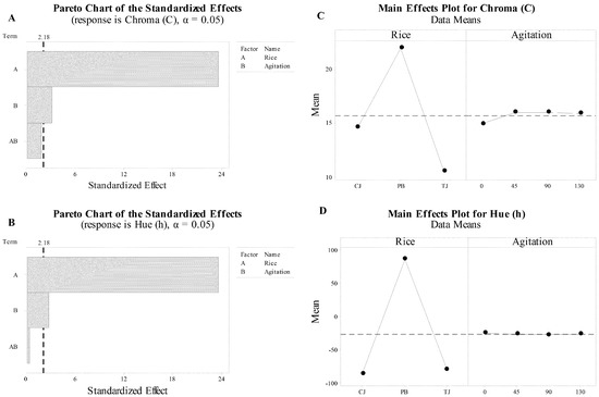The main effects of rice type and agitation to chroma are presented in a Pareto chart (Figure 4A). Both have a significant impact, but rice type has a larger significant effect; the interaction effect was not significant. Similar results were observed for the color parameter, h (Figure 4B), and rice type had the largest significant effect. The plot of the main effect showed that the agitation effect was almost parallel with the X-axis, indicating minimal impact and supported that rice type was the main effect for C (Figure 4C) and h* (Figure 4C). The aromatic rice, CJ and TJ, had negative a* and h* values. Since PB rice and aromatic rice cross quadrant boundaries, measuring the relationship between variables is not practical [41]. However, the aromatic rice (CJ and TJ) were close in the pure spectrum of color.