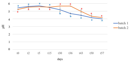 The results of pH measurements are shown in Figure 2. The values detected in the two analyzed batches had a similar trend, although kimchi produced in batch 1 was characterized by a faster pH reduction than batch 2. In more detail, at t0, the pH values were 5.44 ± 0.01 and 5.22 ± 0.06 for batch 1 and batch 2, respectively. A significant drop in pH was observed between t30 and t36 for batch 1, whereas a more progressive reduction was observed in batch 2, where a drop in pH was detected between t36 and t43. At t57 no significant differences were detected between the pH values of both batches, which tested at 3.99 ± 0.01 and 4.17 ± 0.01 for batch 1 and batch 2, respectively.