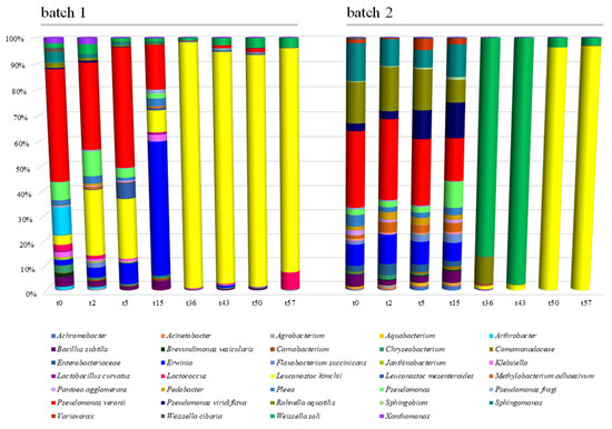 As for Pseudomonadaceae, from t36 to t57, they were <1.0 Log cfu g−1 in both batches.