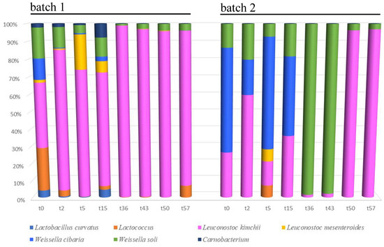 Leuconostoc kimchii was found to dominate in both analyzed batches at the end of fermentation (from t50 to t57). This microorganism was first isolated from kimchi manufactured in Korea, thus suggesting its strong adaptation to this fermented vegetable [49,50,51]. The use of L. kimchi strains as starter cultures for kimchi production was previously evaluated thanks to the potential health benefits for the consumers (e.g., lipid metabolism regulation) [51]. Interestingly, a recent study carried out on diet-induced obese mice reported that in animals administered with L. kimchii GJ2 isolated from Korean kimchi a significant decrease in hepatic triglyceride and fatty acid content was observed [52]. Moreover, Jo et al. [53] reported that kimchi fermented with the strain L. kimchii GJ2 provided efficient cholesterol-lowering effects in rats fed with a high-fat and high-cholesterol diet, thus suggesting the suitable use of this strain for the production of kimchi with functional features. Consistent with the well-known exopolysaccharides (EPS)-producing capabilities of leuconostocs, the production of dextran and levan with potential prebiotic activity by L. kimchi was reported by Schleifer [54] and Torres-Rodríguez et al. [55]. More recently, Rizzello et al. [56] have characterized the EPS production ability and other technological features of a L. kimchi strain for its exploitation as a starter culture for legumes fermentation, thus suggesting the potential suitability of this species for the manufacturing of novel vegetable-based fermented foods.