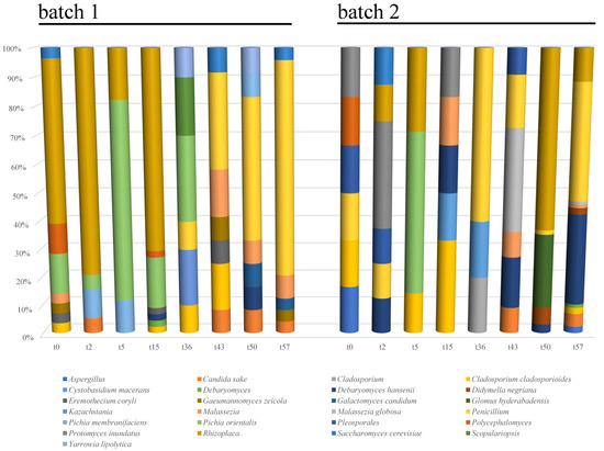 The mycobiota composition at the highest taxonomic level (Figure 7) showed an evolution across time, in both the analyzed batches, with significant differences between them. In batch 1, Rhizoplaca and Pichia orientalis were the dominant OTUs in the first 15 days of fermentation (with approximately 65% and 17% of the relative abundance, respectively), whereas, at the end of fermentation, Penicillium, Candida sake, Malassezia, and Saccharomyces cerevisiae were the most abundant taxa, reaching 67, 8, 7, and 3% of the relative species abundance, respectively.