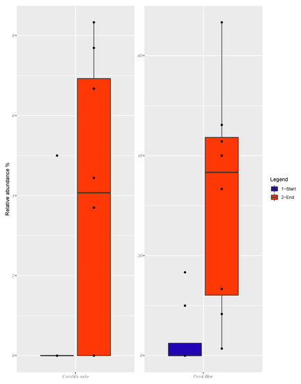 By comparing the relative abundance of the OTUs between the beginning and the end of fermentation, only Weissella soli and Leuconostoc kimchii appeared to be associated with the end of fermentation (FDR < 0.05), whereas the other OTUs (including the minor fraction with <1% of the relative species abundance) were associated with the early step of fermentation (Figure 6).
