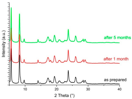 PXRD pattern of (+)-catechin tetrahydrate recorded as prepared (black line), after 1 month (red line) and after 5 months (green line).