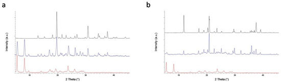 PXRD patterns of: (a) CT tetrahydrate (red line), the solid mixture CT_MA (blue line) and MA (black line); (b) CT tetrahydrate (red line), the solid mixture CT_TA (blue line) and TA (black line). CT = (+)-Catechin; CT_MA = (+)-catechin_mucic acid adduct; MA = Mucic acid. CT_TA = (+)-catechin_tartaric acid adduct; TA = Tartaric acid.