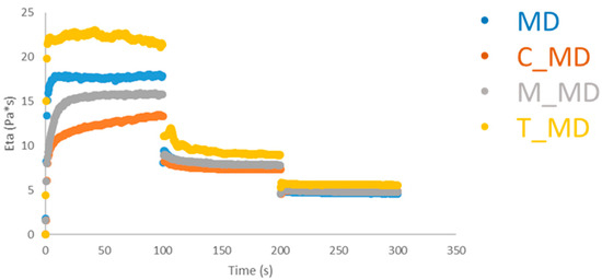 Step Rate muffin dough at 15 °C. MD = muffin dough without baking; T_MD = muffin dough with T_BP; M_MD = muffin dough with M_BP; C_MD = muffin dough with C_BP.