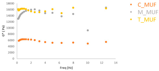 In Figure 6, the frequency sweep tests of baked muffins achieved employing the synthetic baking (M_MUF and T_MUF) and commercial one (C_MUF) are reported. It is worthy to note the effects of different baking on the rheological properties of the final products. The trends are almost flat in frequency (the structure is formed by large network thus a high coordination number); additionally, the higher values as a function of the frequency observed for T_MUF and M_MUF can be related to the higher “interaction strength” between the rheological units (stronger links).