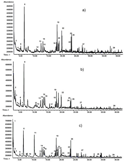 In the GC profiles (Figure 8) of the analyzed samples, about 29 volatile compounds, belonging to different chemical classes, were tentatively identified by matching the corresponding mass spectra to those of the mass spectral library or by comparing retention times and mass spectra with those of available standards (Table 4). The relative peak area percentage for each compound was defined as the ratio between the peak area for that compound and the sum of all identified peaks areas in that sample.