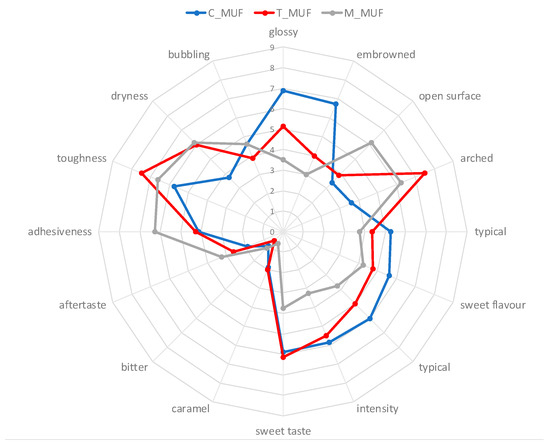 Sensory profiles for C_MUF, T_MUF and M_MUF muffins are shown on Figure 9.