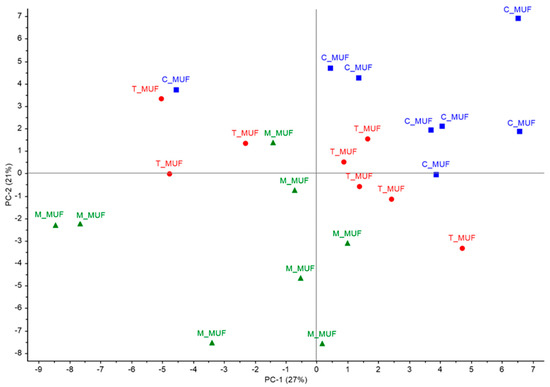 PCA Score plot of sensory evaluation of C_MUF, M_MUF and T_MUF muffin samples. C_MUF = Muffin prepared by C_BP; M_MUF = Muffin prepared by M_BP; T_MUF = Muffin prepared by T_BP.
