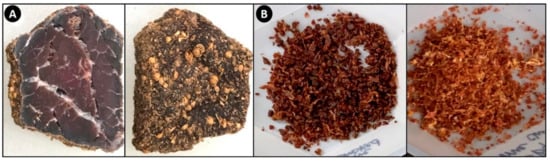Sampling biltong for salt ion analyses: (A) representative in-house manufactured biltong after 8 days of drying showing the inside of dried beef muscle tissue (left) and retention of surface seasoning (right); (B) finely ground biltong samples to be mixed in water for ion analysis.