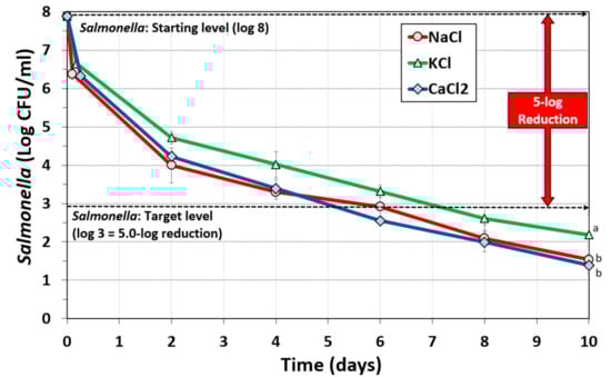 Biltong processing using alternative salts for reduction of Salmonella. Comparison of NaCl, KCl, and CaCl2 at a concentration of 2.2% to attempt a 5-log reduction of Salmonella population over a period of ten days at 23.9 °C (75 °F) and 55% relative humidity (RH). Statistical analysis of entire time course of graphs: treatments with the same letter are not significantly different (p > 0.05); treatments with different letters are significantly different (p < 0.05).