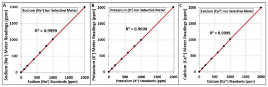 Ion analyses on standardized salt solutions using ion selective electrode (ISE) meters used in this study. Panel (A), ion analysis of Na+ using NaCl standards; (B), ion analysis of K+ using KCl standards; (C), ion analysis of Ca2+ using CaCl2 standards. Individual standards were prepared in triplicate and data points represent the mean of triplicate samplings with error bars representing the standard deviation of the mean. The coefficient of determination is a measure of the linearity of the data points to the trendline is indicated by R2 value.