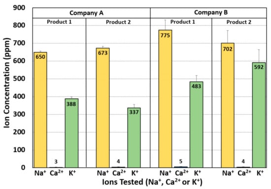 Individual Horiba LAQUA Twin Pocket Ion Meters (Horiba Intruments, Irvine, CA, USA) were used for Na+, Ca2+, and K+ ion quantitation. Although the instruments came with an ion standard solution, we also prepared a series of standards that would reflect the various levels experienced in our testing to ensure the linearity of the response throughout this range. As per the manufacturer’s instructions, 300 μL of the diluted/mixed sample was placed into the sensor chamber of the appropriate salt meter and stable readings (in ppm) were recorded. Readings were taken in duplicate from three different batch trials. Additionally, each sample was also tested in the remaining two ion meters to confirm the presence or lack of any additional salt ions. To determine the ion concentration content per serving size, the following equation was used: