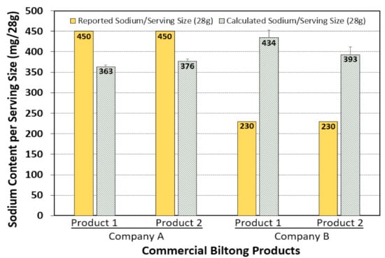 Additionally, the Na+ content per serving size (28 g) of each of the commercial biltong samples was calculated using the experimental Equation (3) and was compared to the reported sodium content on the dietary label. Both products from Company A over-stated the Na+ content on their label compared to the calculated (lower) Na+ content that was determined from their product using the ISE meters (Figure 7). Conversely, the products made by Company B significantly under-stated the Na+ content on their labels compared to the significantly higher Na+ content calculated by analyses of their products (Figure 6). Ion analyses done for experimental biltong produced in this study obtained similar values as Company A (i.e., 374 mg Na+/28 g biltong). Substitution of different salts for NaCl demonstrated significantly lower levels of Na+ per serving size of biltong: i.e., 30 mg Na+/serving when CaCl2 was used, or 32 mg Na+/serving when KCl was used (Table 2) while still achieving ≥ 5-log reduction of Salmonella (Figure 2).