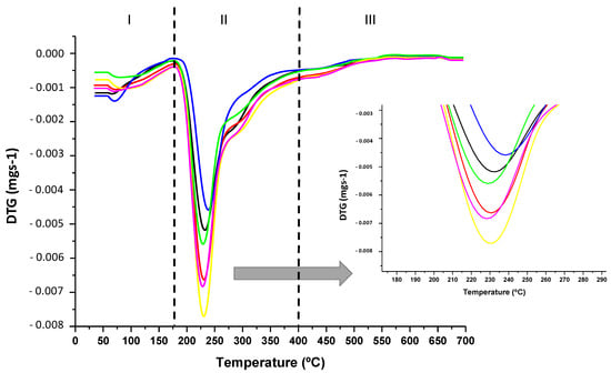 DTG curves of pectin-based films: PC (------), PC-1ZnO (------), PC-3ZnO (------), PC-5E (------), PC-5E-1ZnO (------) and PC-5E-3ZnO (------).