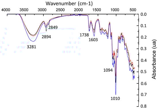 The FTIR spectra of neat pectin, CBSE-2 and active pectin-based films exhibited distinctive peaks in the 4000–500 cm−1 range. The PC film (Figure 3) showed a broad peak centred at 3281 cm−1 which was attributed to O–H stretching vibrations [], while bands centred at 2894 and 2849 cm−1 were related to C–H stretching vibrations of methylene groups and methyl group of pectin polymer chains, respectively []. The intense bands observed at 1738 and 1603 cm−1 were associated with the ester stretching vibrations of the -COCH3 group and the asymmetric stretching vibrations of the carboxylate anion –COO−, giving an indication of the high methoxylation of the pectin molecules [,]. Some other bands were also obtained in the 1360–800 cm−1 range, which were related to the stretching vibrations of the C–O–C and C–C bonds of the carbohydrate ring [].