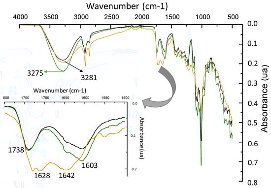 The FTIR spectra of PC and PC-5E films and CBSE-2 are compared in Figure 4. As can be seen, no important changes in the spectrum of neat pectin were observed with the addition of 5 wt% of CBSE-2. However, a significant shift of the band at 3275 cm−1 was found in the PC-5E film compared to the CBSE-2 spectrum, which was associated with the interaction between the hydroxyl groups of the polyphenolic compounds and polysaccharides present in the cocoa extract [] with the pectin matrix. The typical absorption peaks of polysaccharides at 1014, 1070 and 1119 cm−1 were observed in the CBSE-2 spectrum and they were assigned to the –C–OH, –C–C– and –C–O– vibration modes, respectively []. Finally, two bands centred at 1628 and 1642 cm−1 with similar intensity were detected in CBSE-2 spectra, confirming the presence of some pectin in CBSE-2, as these bands are usually used to determine the esterification degree of pectin [,,], suggesting a value around 50%.