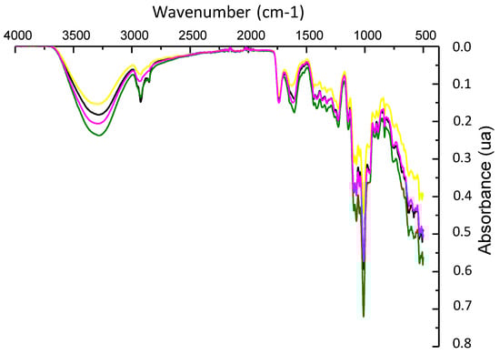 Finally, Figure 5 shows the FTIR spectra obtained for PC, PC-5E, PC-5E-1ZnO and PC-5E-3ZnO films. No noticeable changes were obtained, suggesting that the addition of CBSE-2 and ZnO/Zn-NPs did not produce significant changes in the pectin structure. A similar behaviour was reported by other authors with the incorporation of ZnO-NPs [] or natural extracts derived from plants [] into polymer matrices.