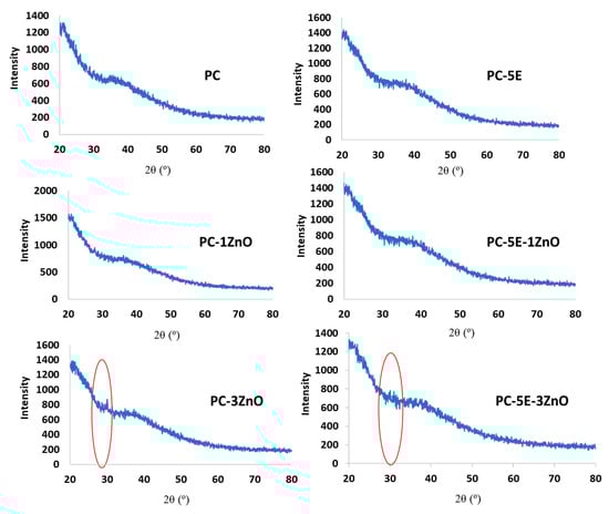 Regarding pectin-based films, no specific diffraction peaks were observed for the neat pectin film (Figure 7), giving a clear indication of its amorphous structure as already reported by other authors [,,]. The diffraction pattern of the studied nanoparticles was overcome by that of pectin at low ZnO/Zn-NP content [], resulting in a completely amorphous structure for pectin-based films with 1 wt% of ZnO/Zn-NPs. However, when the concentration of ZnO/Zn-NPs was increased up to 3 wt%, two diffraction peaks between 30 and 35° were detected in films (circled area in Figure 7), corresponding to the major diffraction peaks observed in nanoparticles and suggesting the good incorporation of ZnO/Zn-NPs into the pectin matrix.