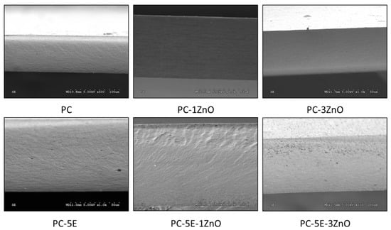 The microstructure of active pectin-based films containing CBSE-2 and ZnO/Zn-NPs was studied by SEM to get insight into the incorporation of the active compounds, their organisation along the biopolymer film matrix and their possible influence on the films’ final properties. The cross-section micrographs of all pectin-based films are shown in Figure 8. A uniform and homogeneous surface was observed in all samples, demonstrating the good incorporation of CBSE-2 and ZnO/Zn-NPs into the pectin matrix. In addition, PC5E-1ZnO and PC5E-3ZnO films showed an apparent improvement in the nanoparticle dispersion through the pectin matrix when compared to film samples without the incorporation of CBSE-2. This behaviour was related to the presence of some antioxidant compounds in CBSE-2, increasing the possibility of the formation of hydrogen bonds between active compounds, nanoparticles and the pectin matrix []. The presence of both active additives in pectin-based films also placed ZnO/Zn-NPs mainly on the surface of the pectin films, particularly at the highest nanoparticle concentration. This behaviour may be due to the higher affinity between pectin and CBSE-2, displacing the nanoparticles to the material surface [].