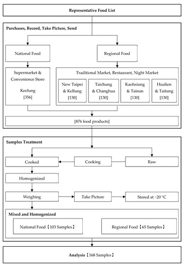 The national food products were nationwide samples depending on the market brand name proportions. Food items were purchased at supermarkets and convenience stores in Keelung City. The regional food products were samples taken from the north, west, south, and east regions in Taiwan. The most populated county or city and a random county or city among each region were selected. A total of eight counties or cities (New Taipei City and Keelung City in the Northern region; Taichung City and Changhua County in the Central region; Kaohsiung City and Tainan City in the Southern region; and Hualien County and Taitung County in the Eastern region) were sampled in traditional markets, restaurants, and night markets between September and December 2016. After the sample collections were completed, 876 purchased food products were classified according to the 285 food subcategories. After cooked or processed to ready-to-eat, food products were separately mixed and homogenized into 168 samples for analysis (Figure 1).